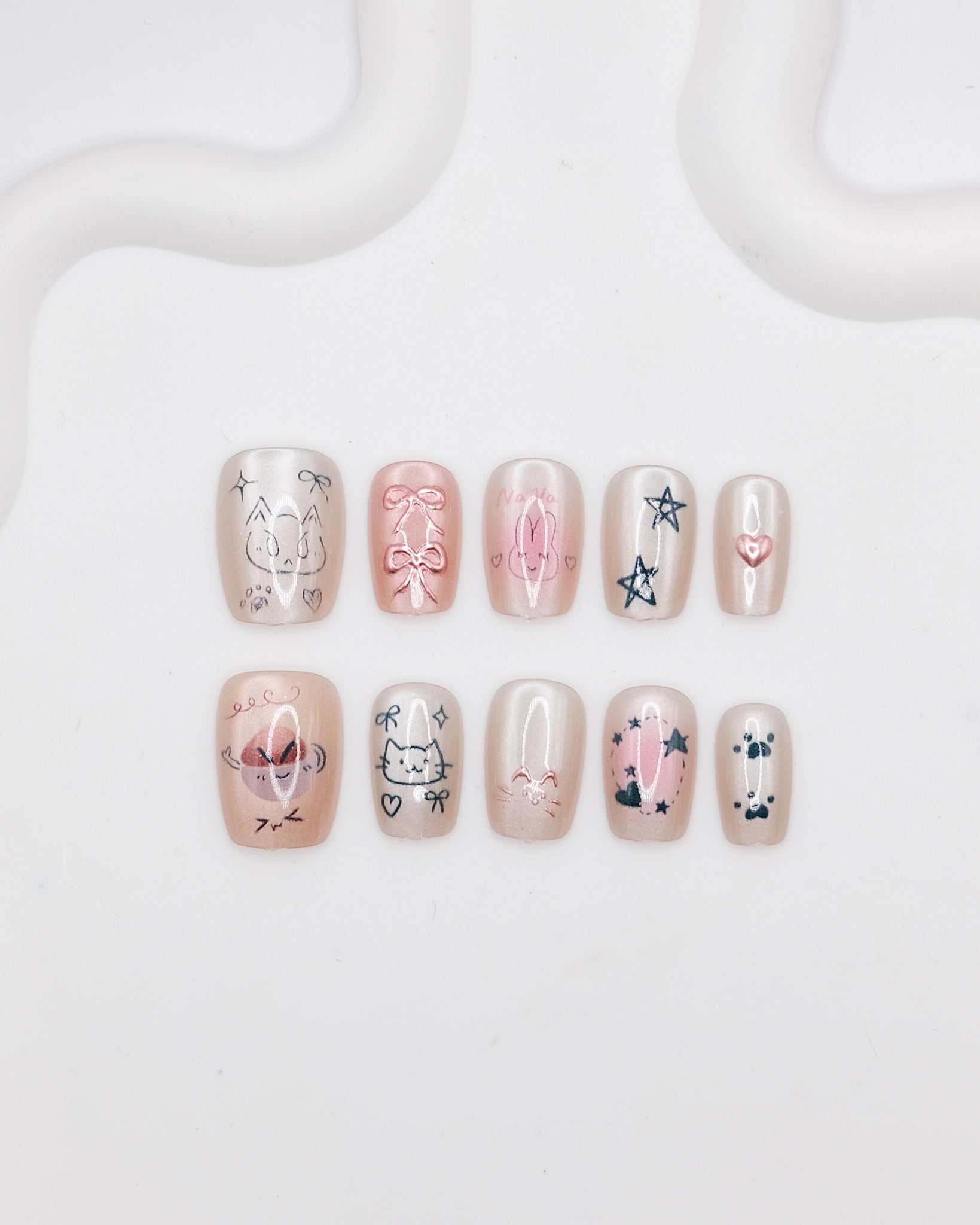 Short Coffin Nude Color Pink Bowtie Cat Press On Nails