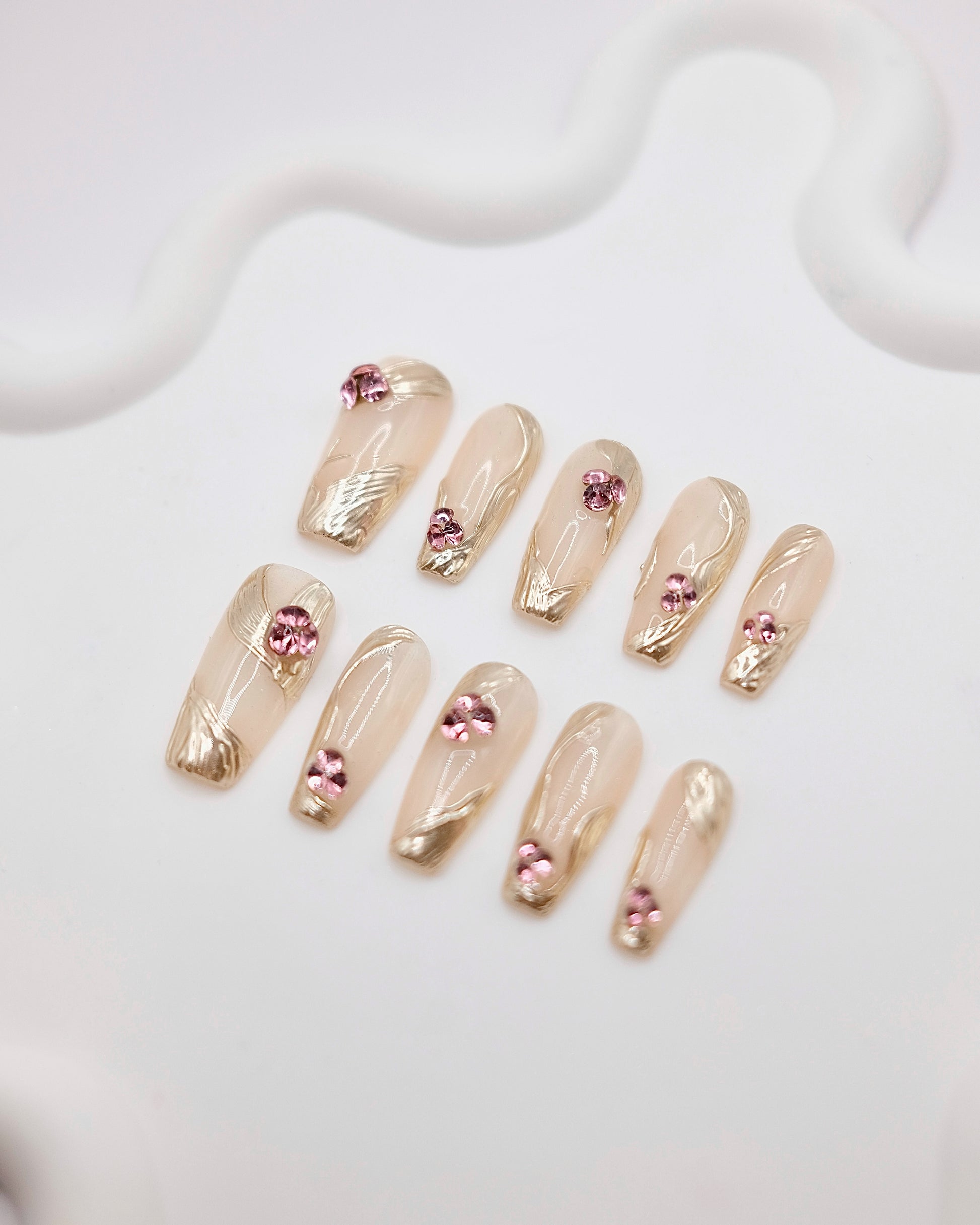 BUYRII X H² Long Coffin Gold Embossed & Diamond Shy Press On Nails
