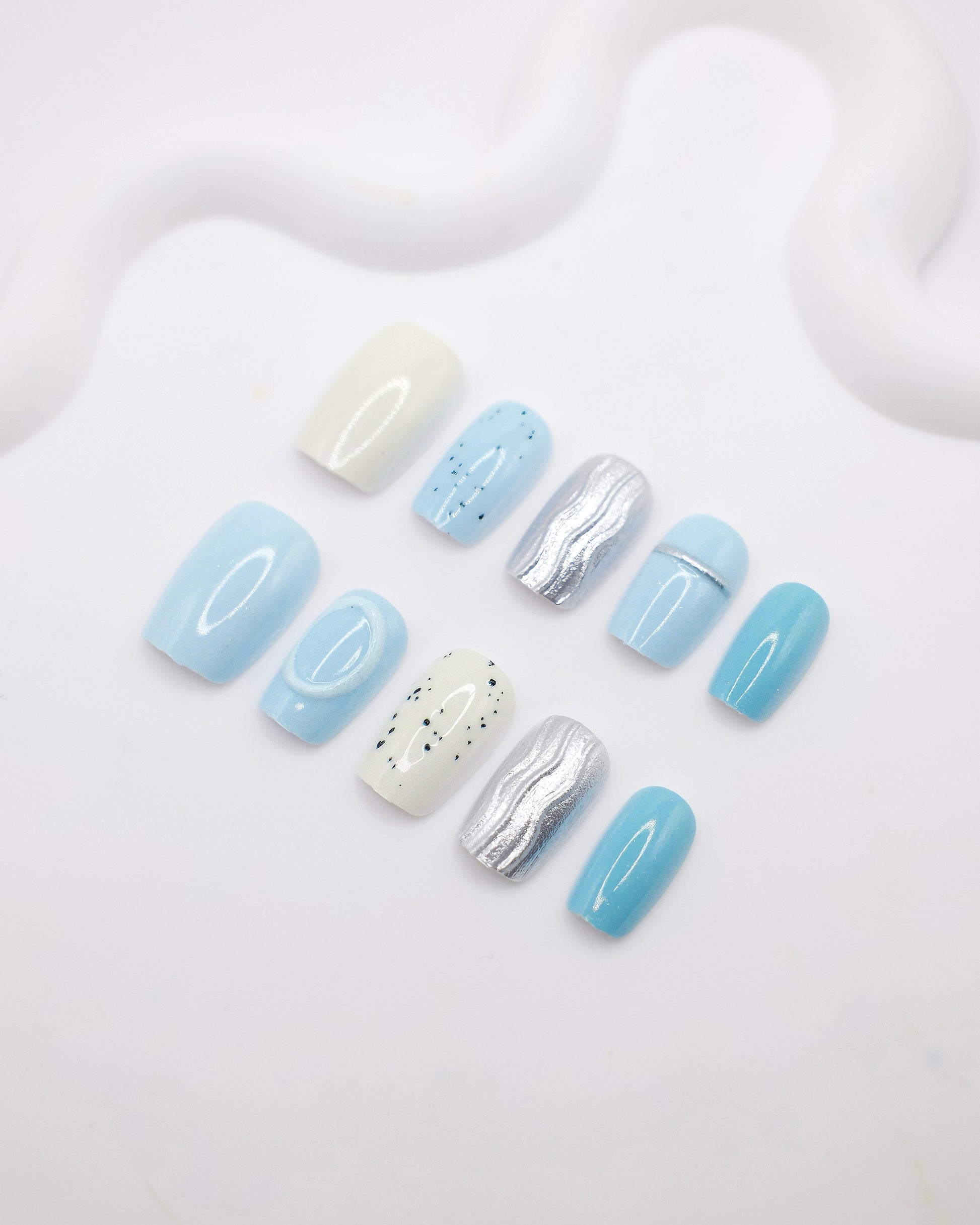 Short Coffin Blue & Silver With Embossed Line Press On Nails