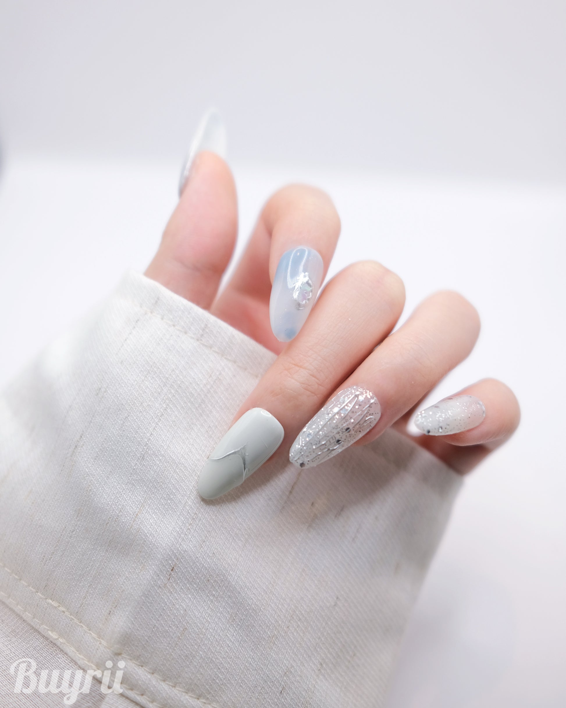 Long Almond Blue & White Pearl Press On Nails