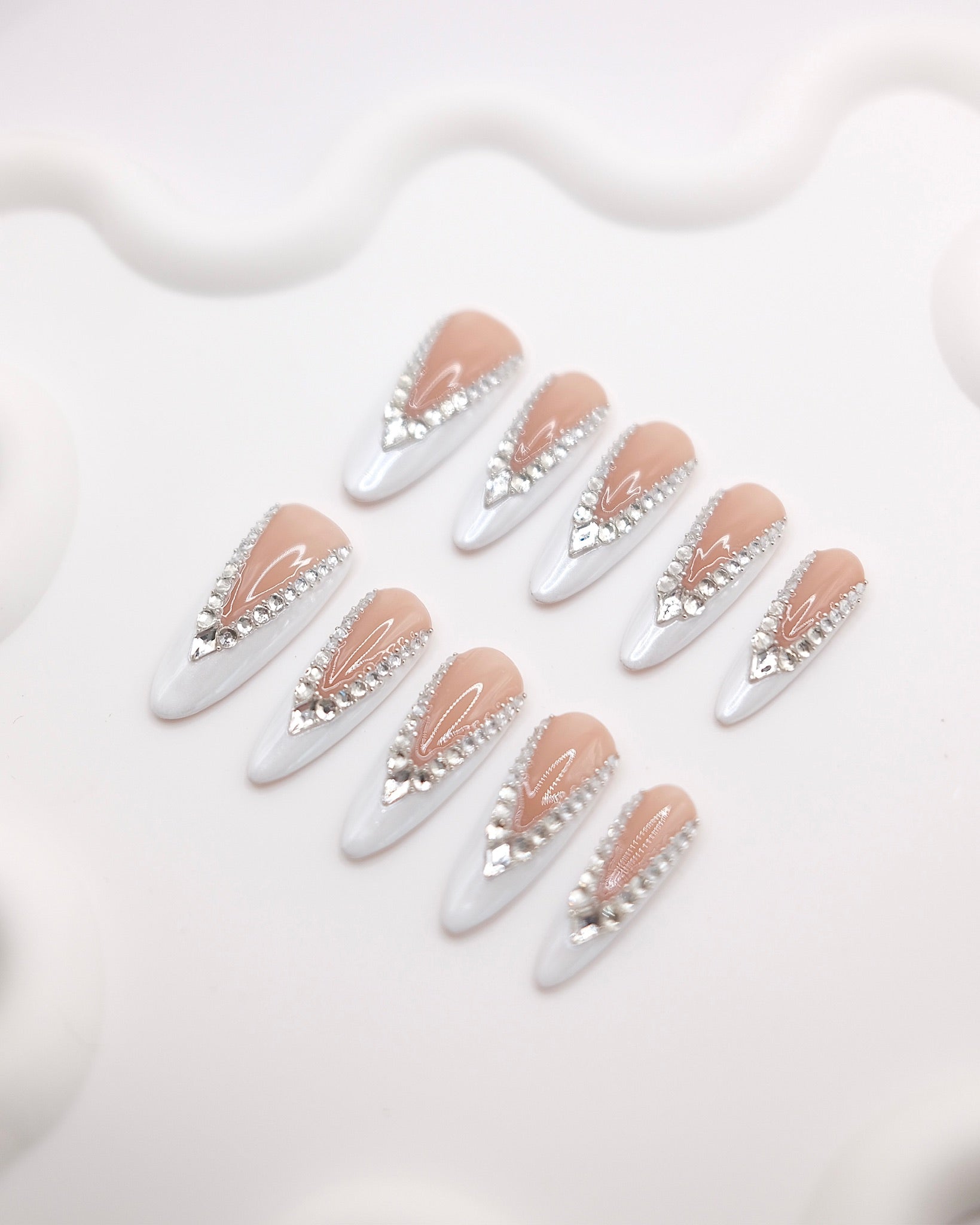 Long Almond Nude Color & White Arounded Diamond Press On Nails