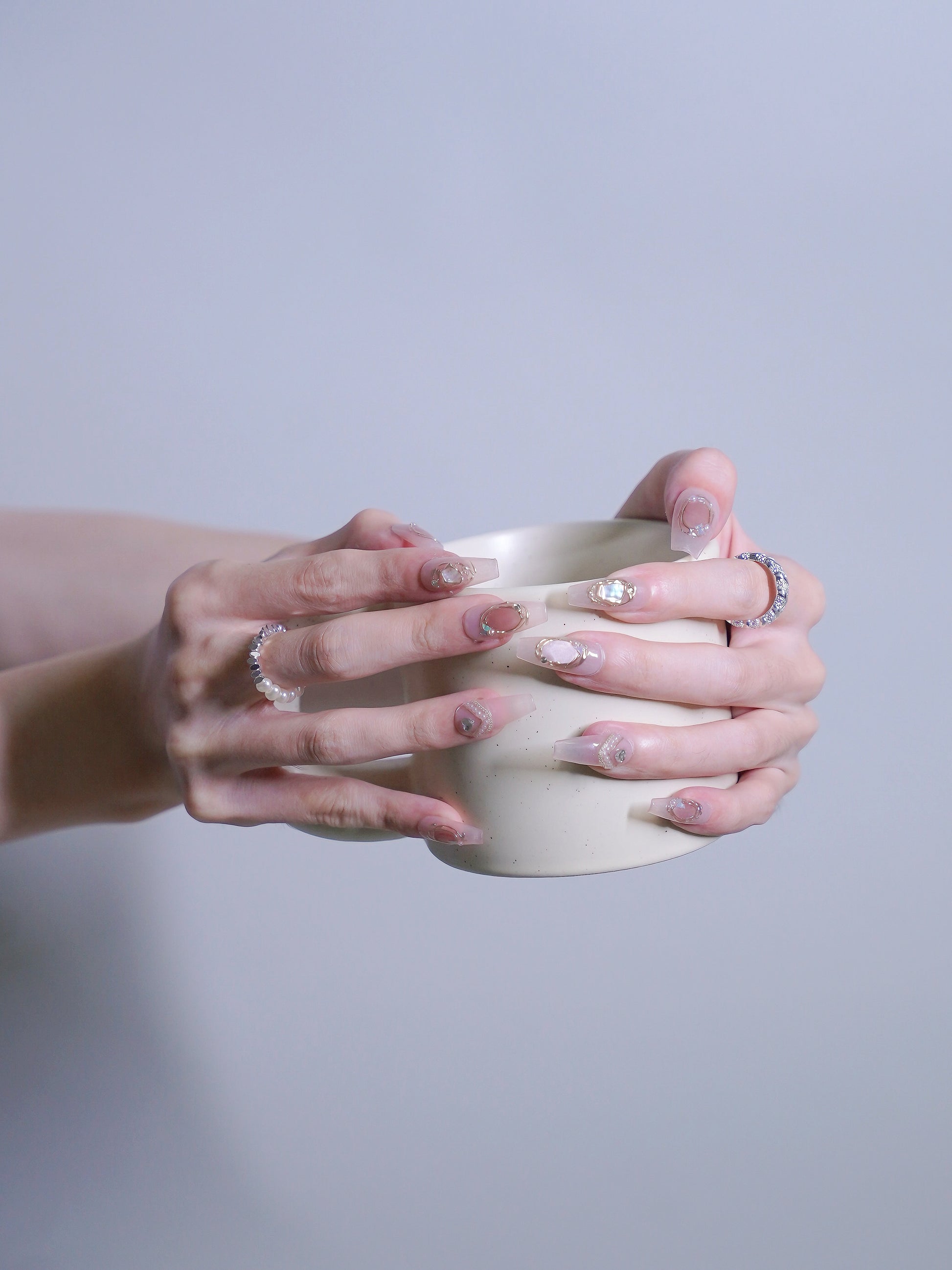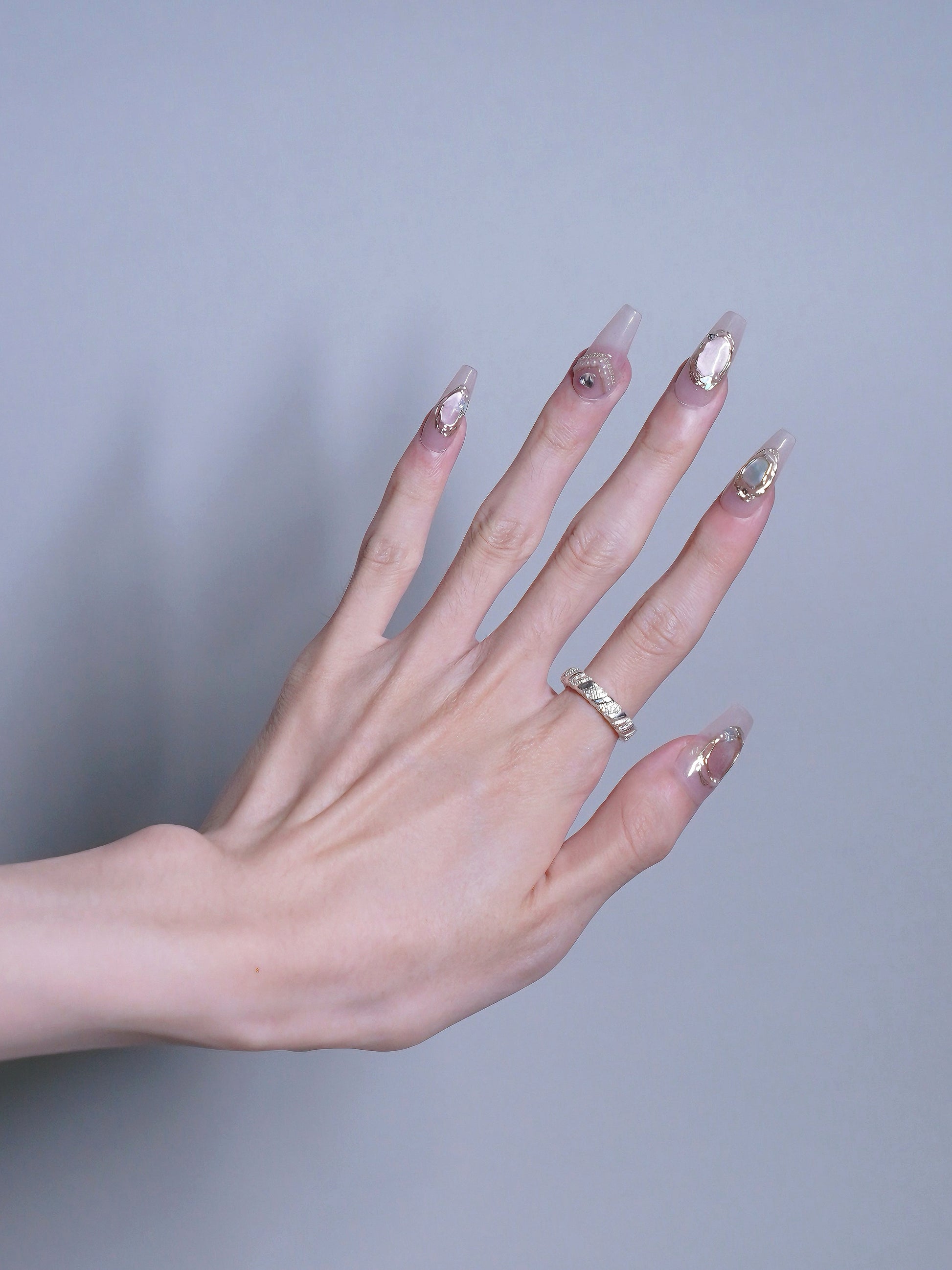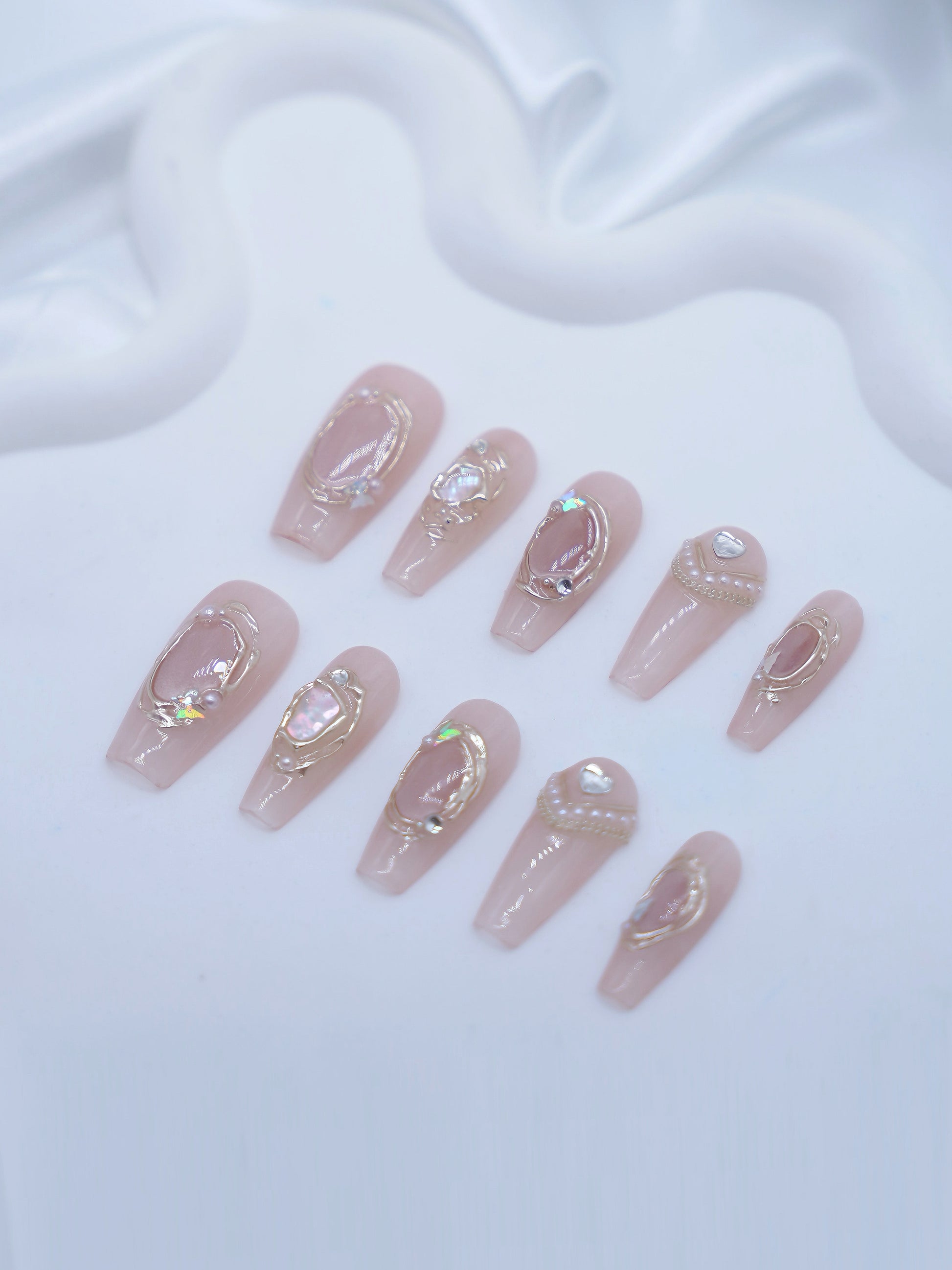 Long Coffin Pink Pearl & Diamond Press On Nails