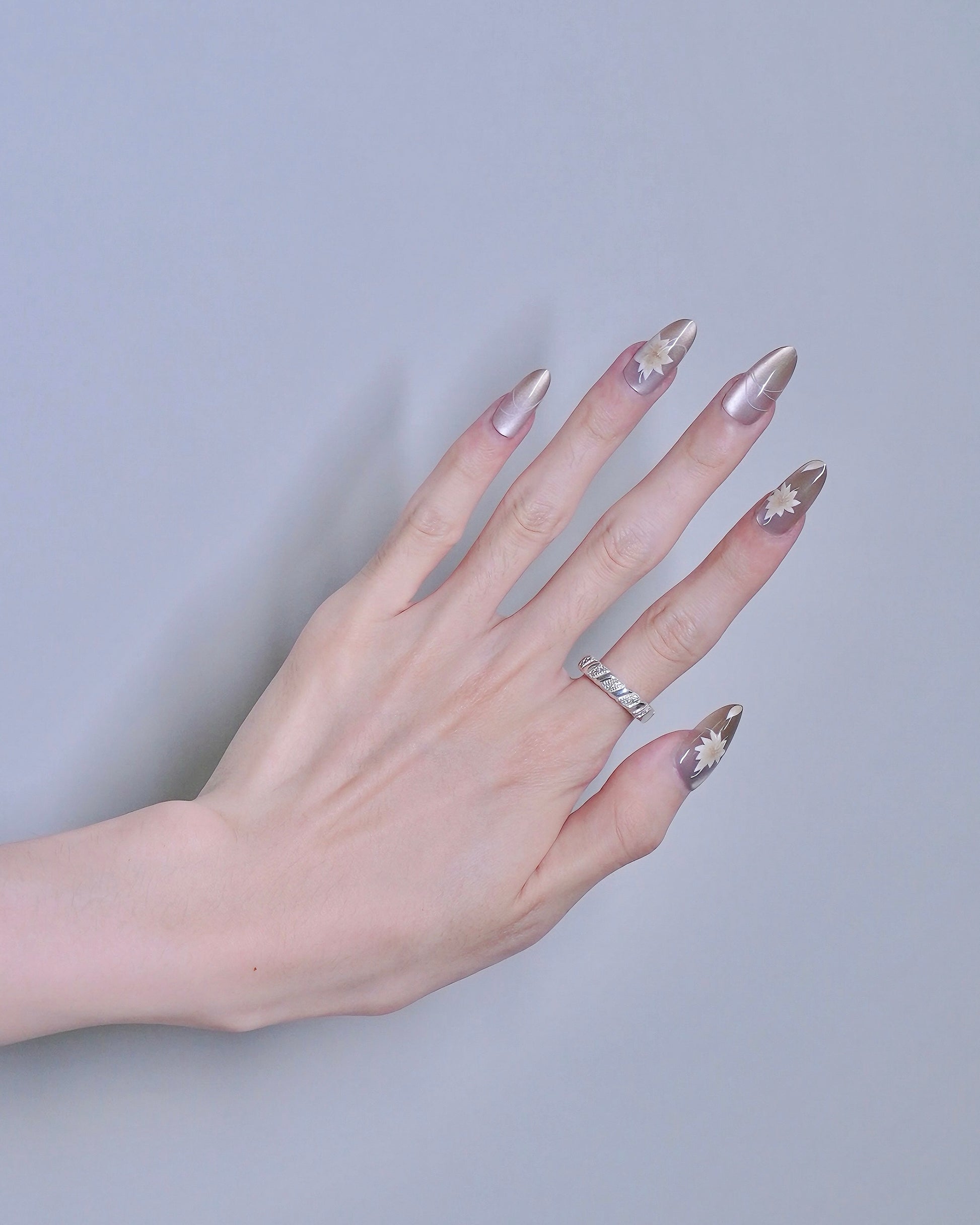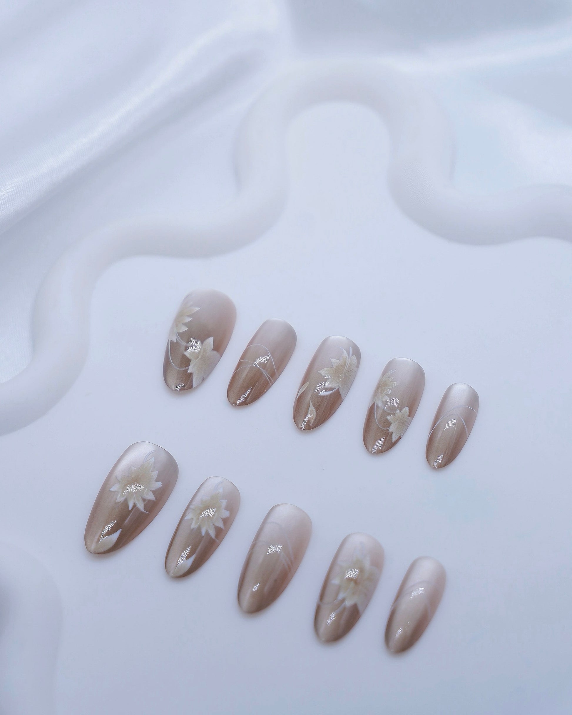 Mid-Long Almond Cateye Nude Color Flower Press On Nails