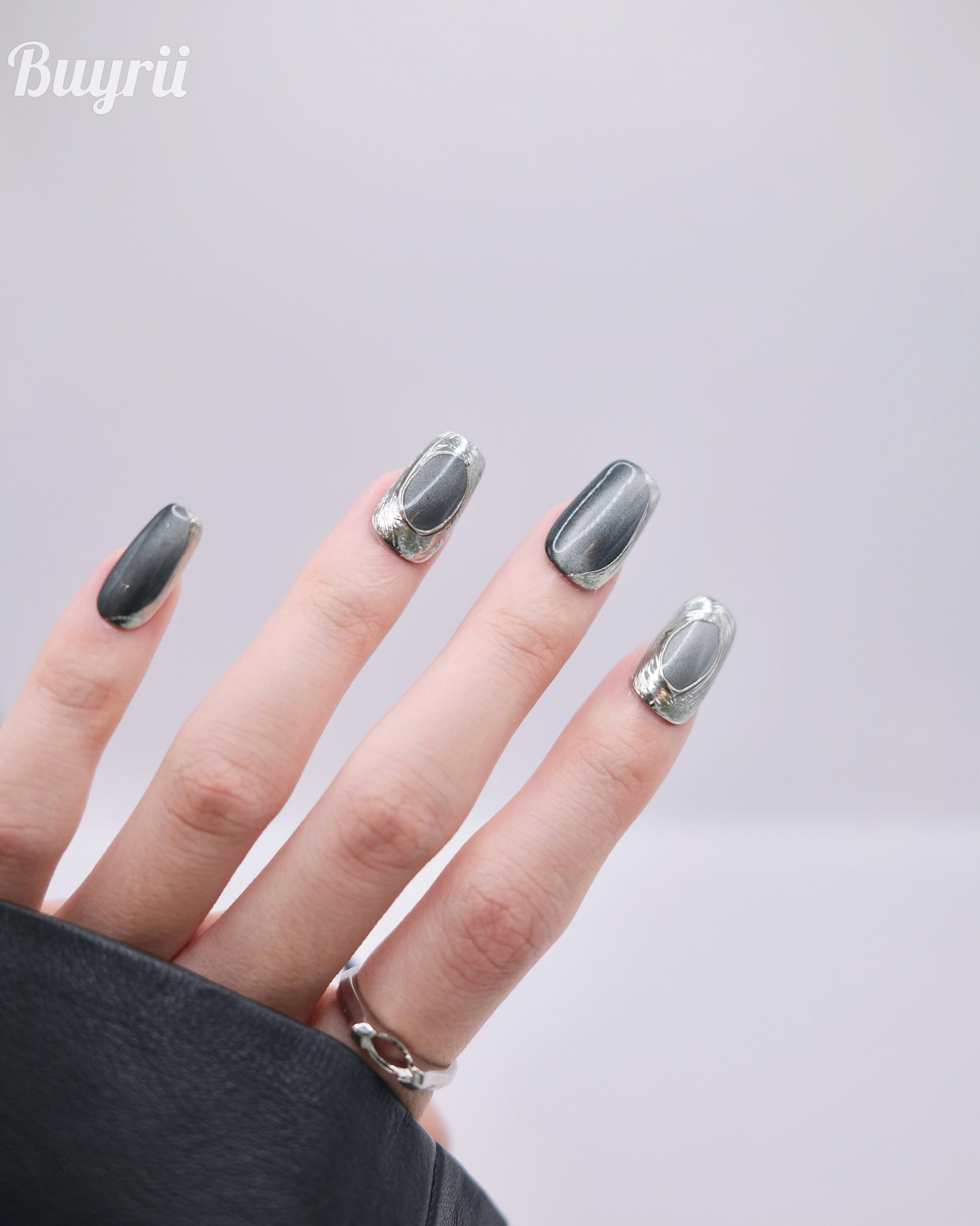 Mid-Long Coffin Black & Silver Magic Mirror Press On Nails
