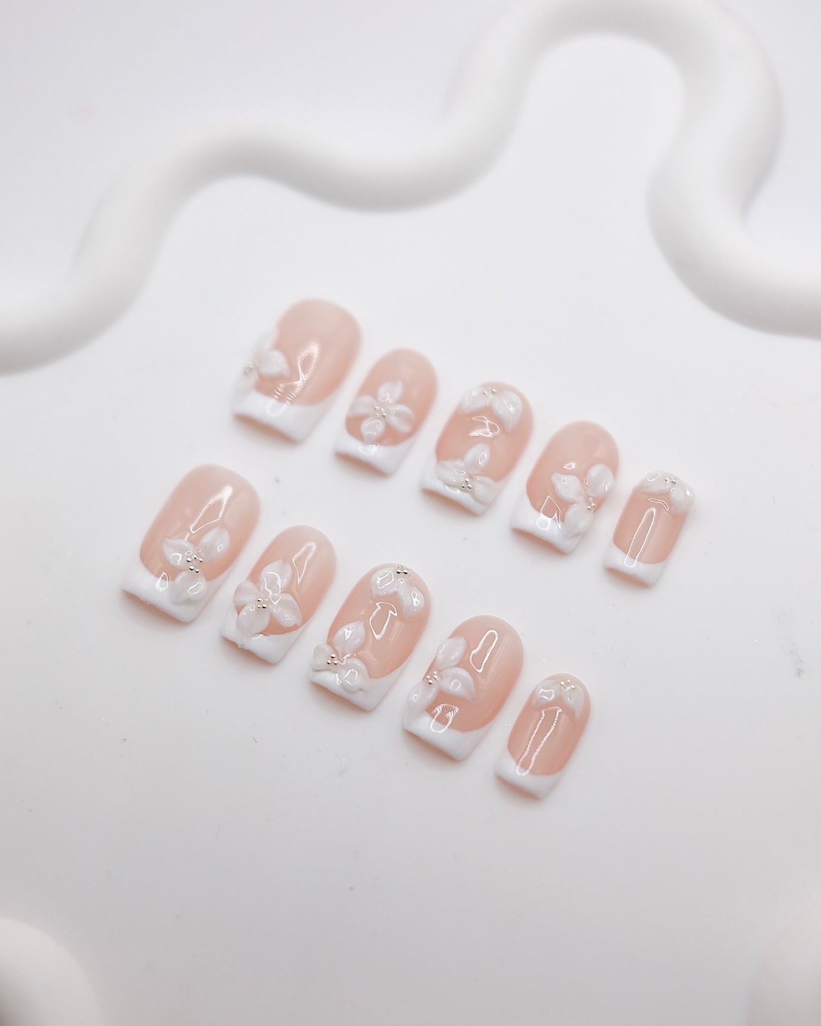 Mid-Long Coffin Nude Embossed Flower French Manicure Press On Nails