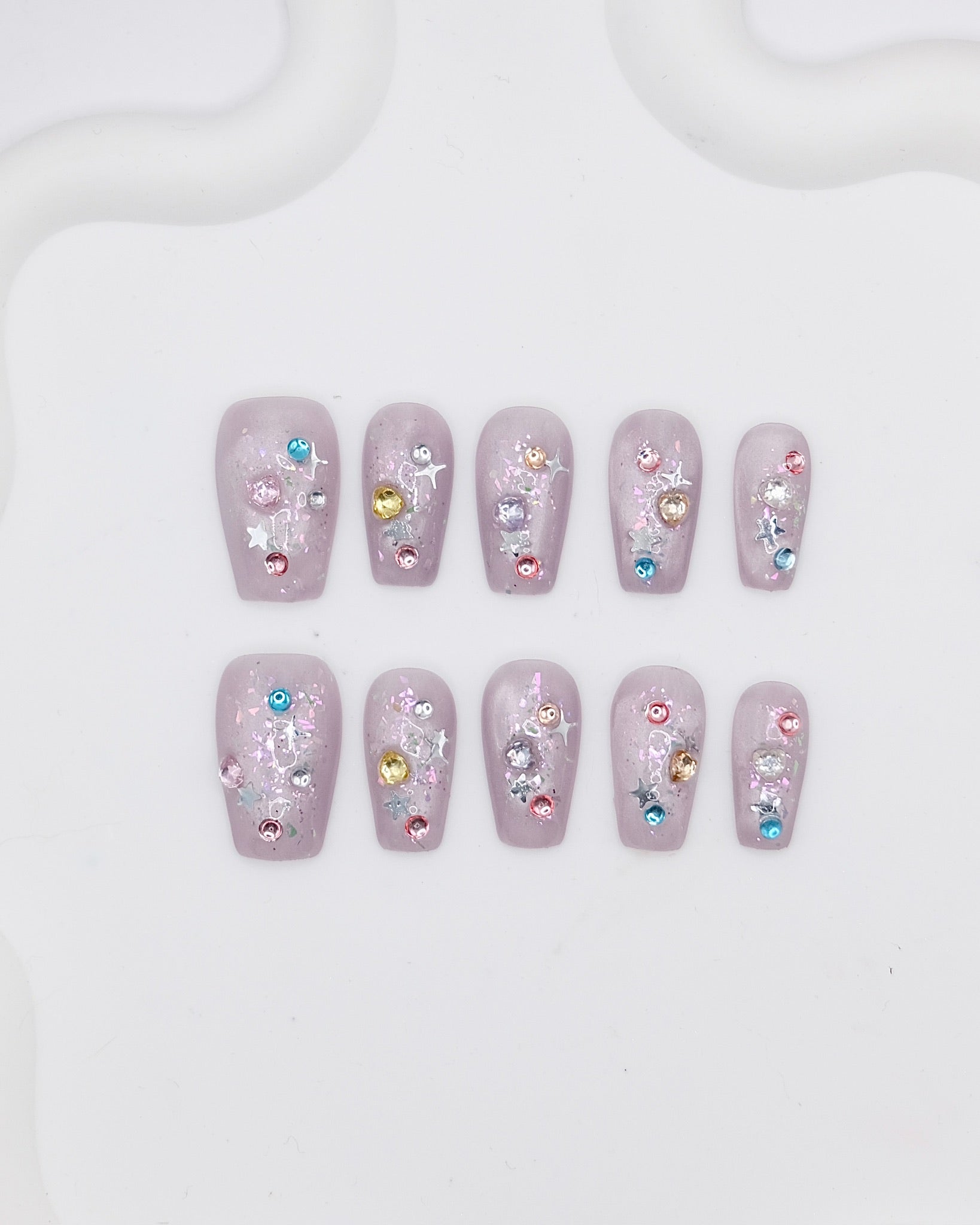 Mid-Long Coffin Purple Cateye Colorful Gem Design
