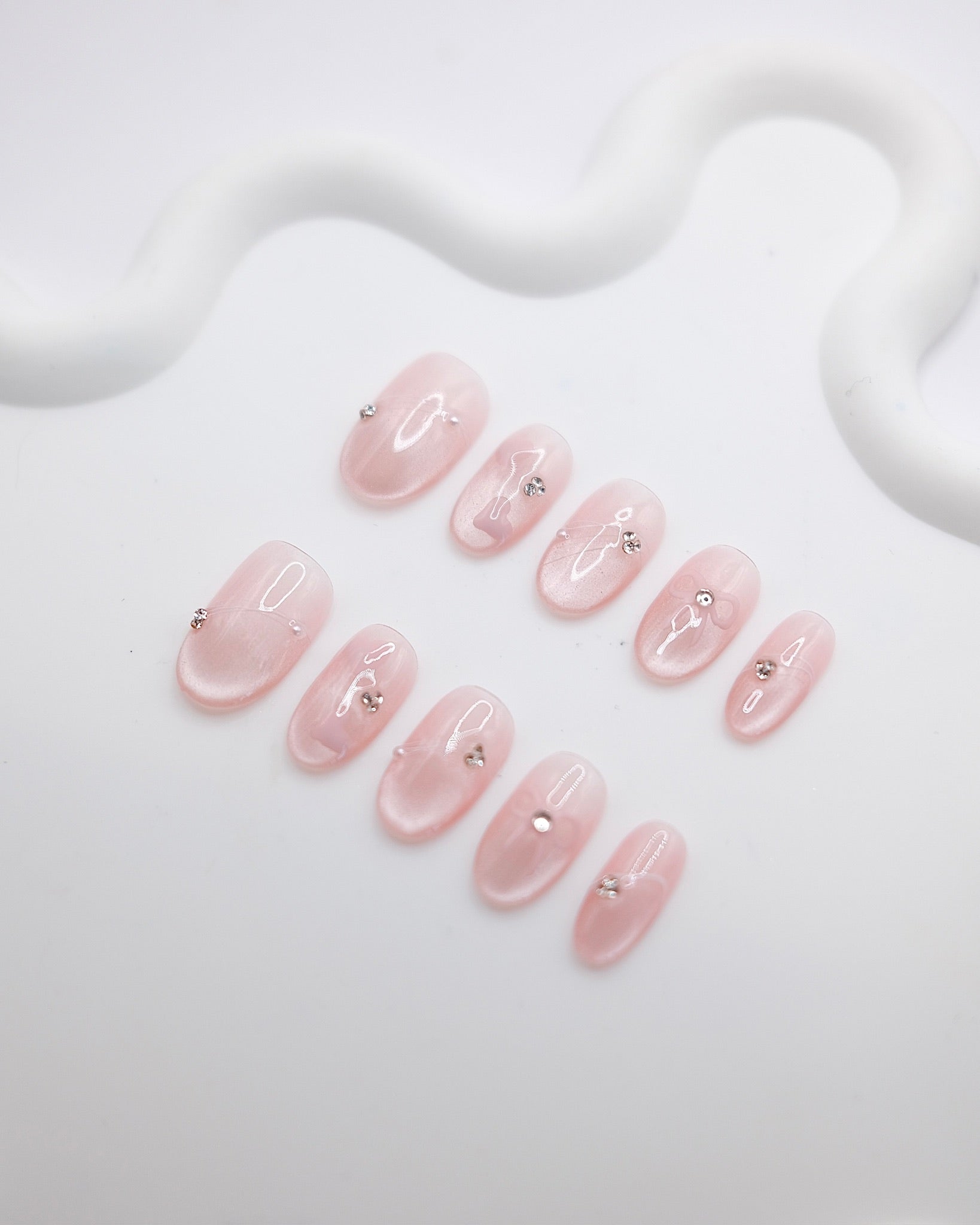 Mid-Long Oval Cateye Pink Diamond Shiny Bowtie Press On Nails