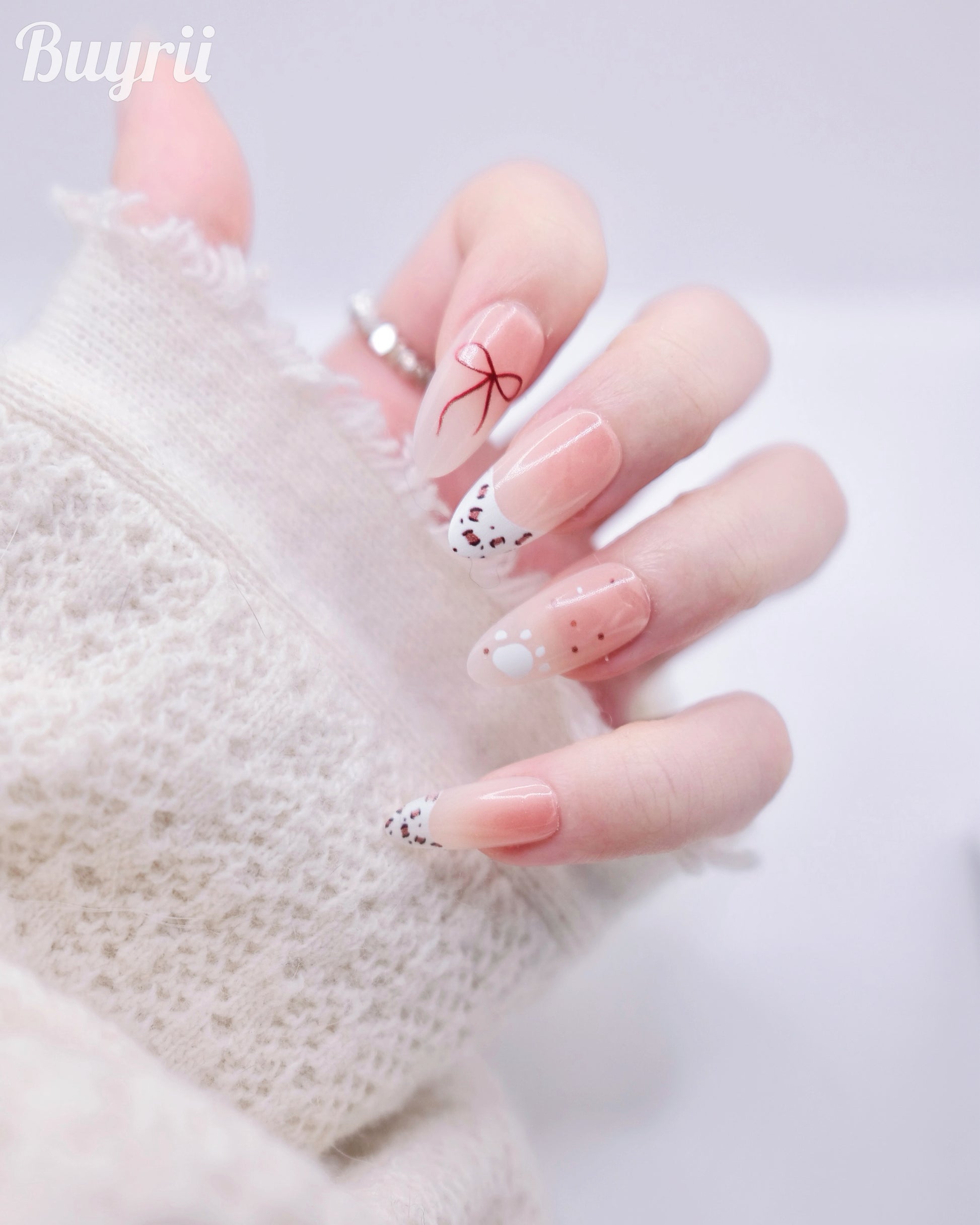Mid-Long Oval Nude Color Cute Bear With Bowtie Press On Nails