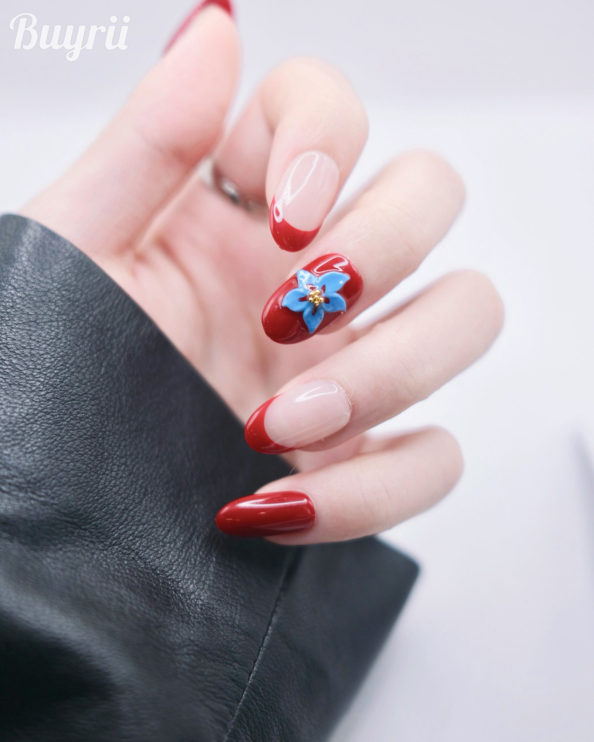 Mid-Long Oval Red & Nude Color Flower French Manicure Design