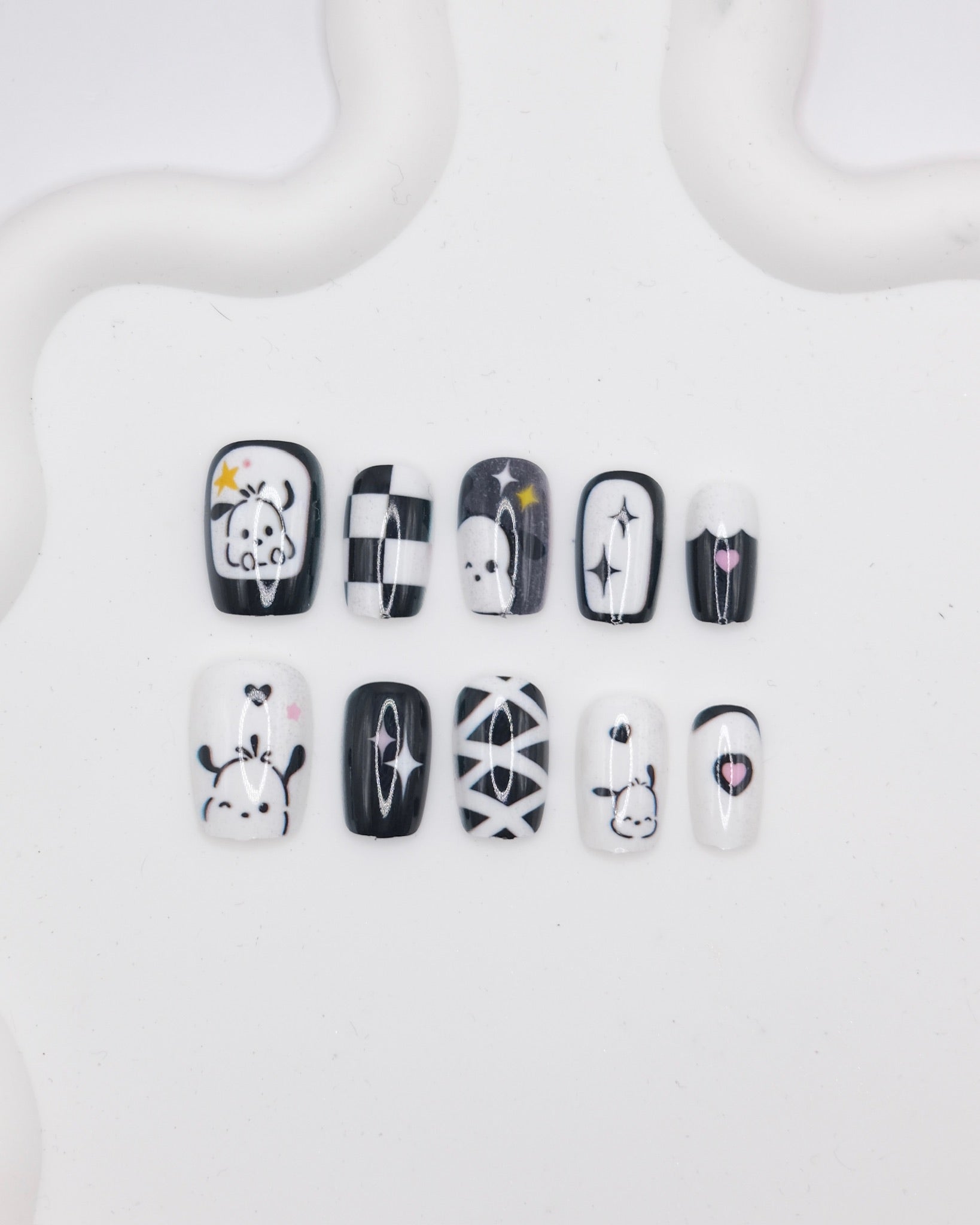 Short Coffin Black & White Anime Pochacco Press On Nails