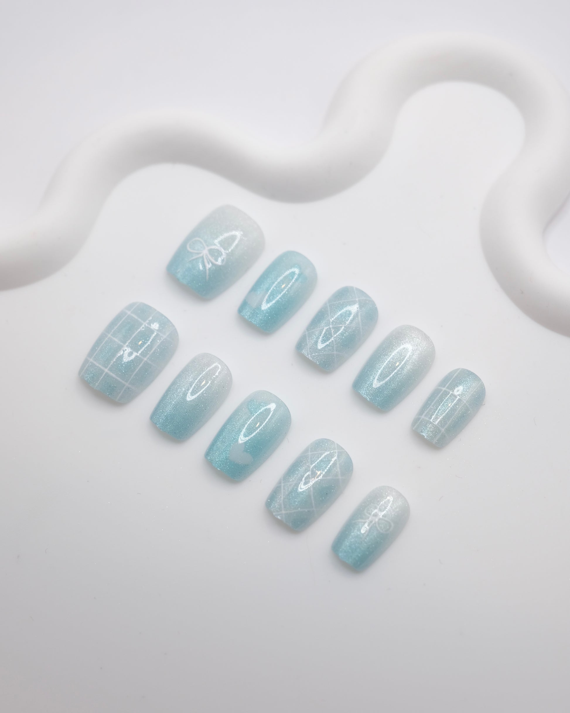 Short Coffin Blue Bow Tie & Love Heart Press On Nails