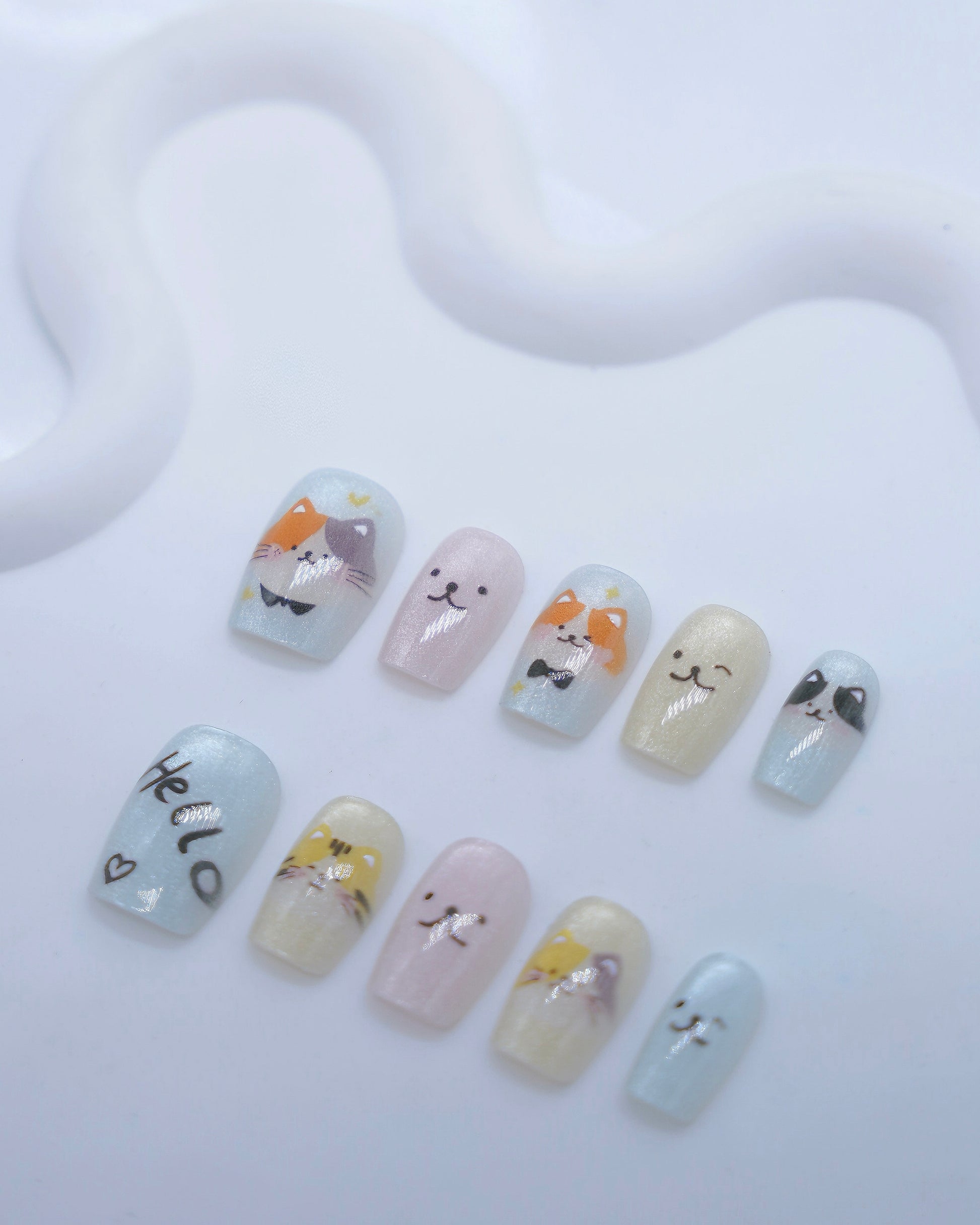 Short Coffin Cateye Colorful Cute Kitty Press On Nails
