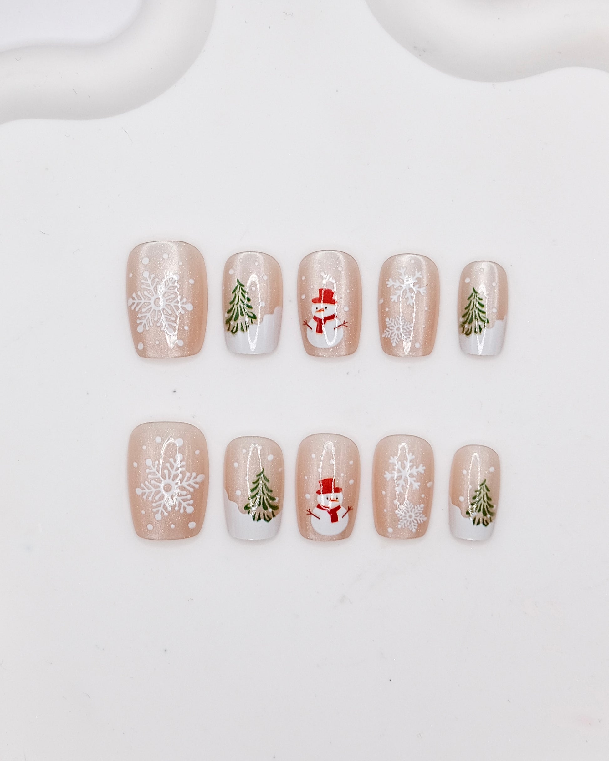 Short Coffin Christmas Nude Color Snowman Press On Nails