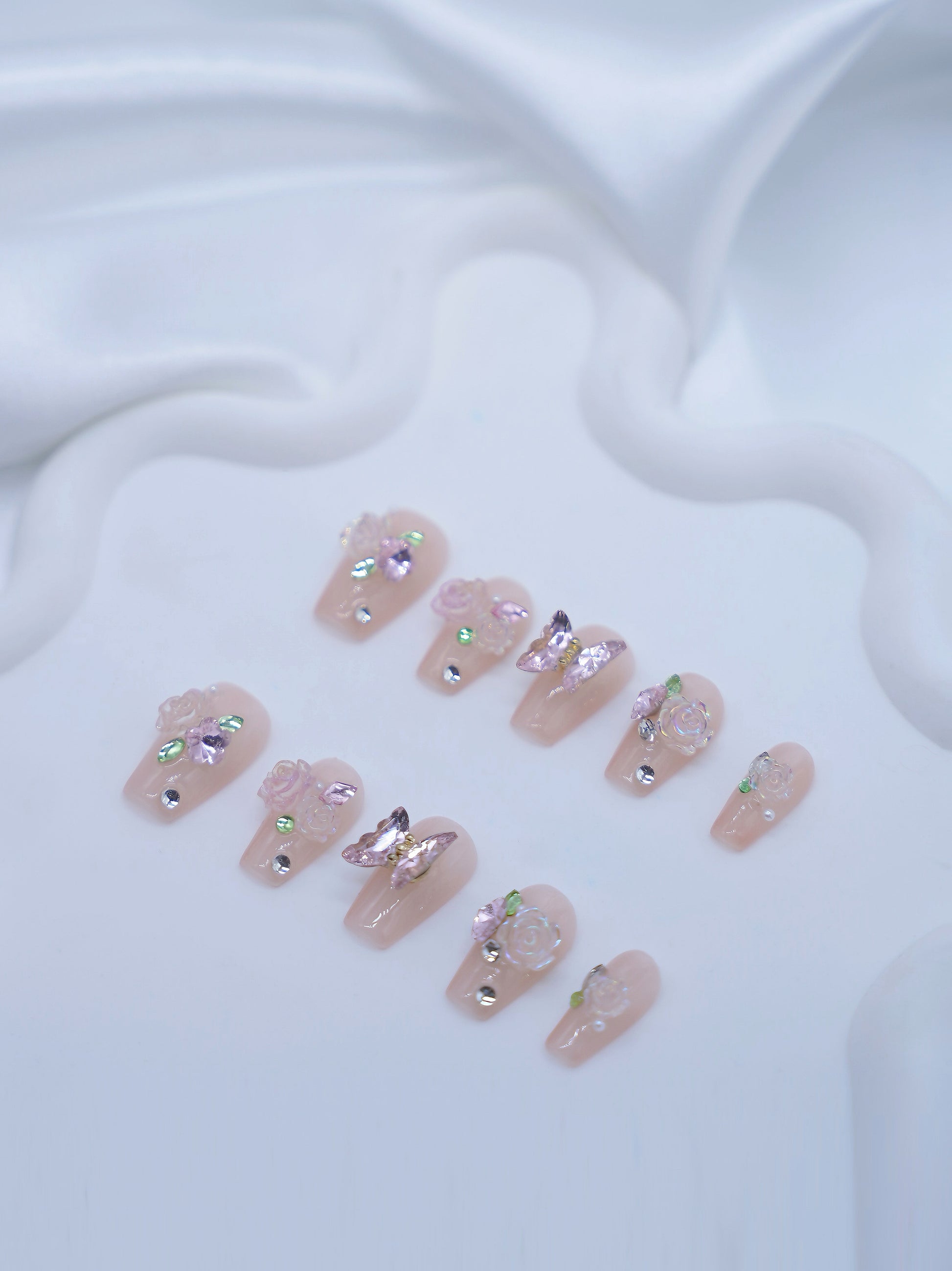 Short Coffin Pink Diamond & Purple Butterfly Press On Nails