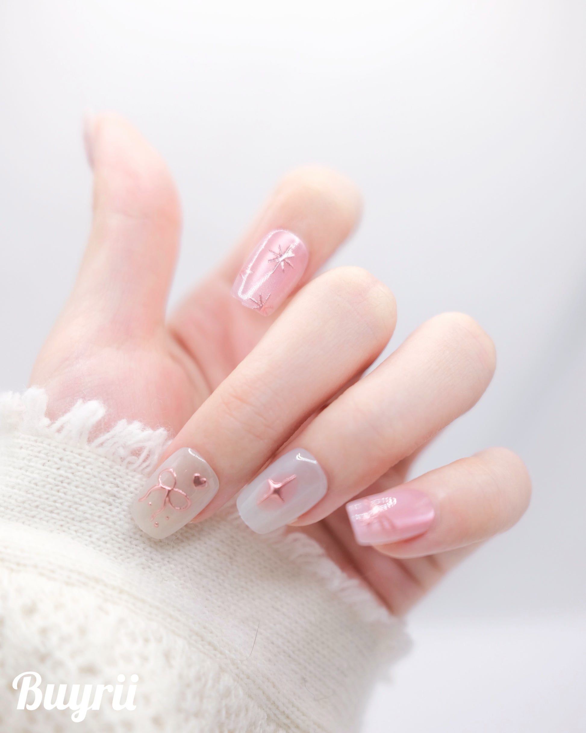 Short Coffin Pink & Nude Dreamy Bowtie Press On Nails