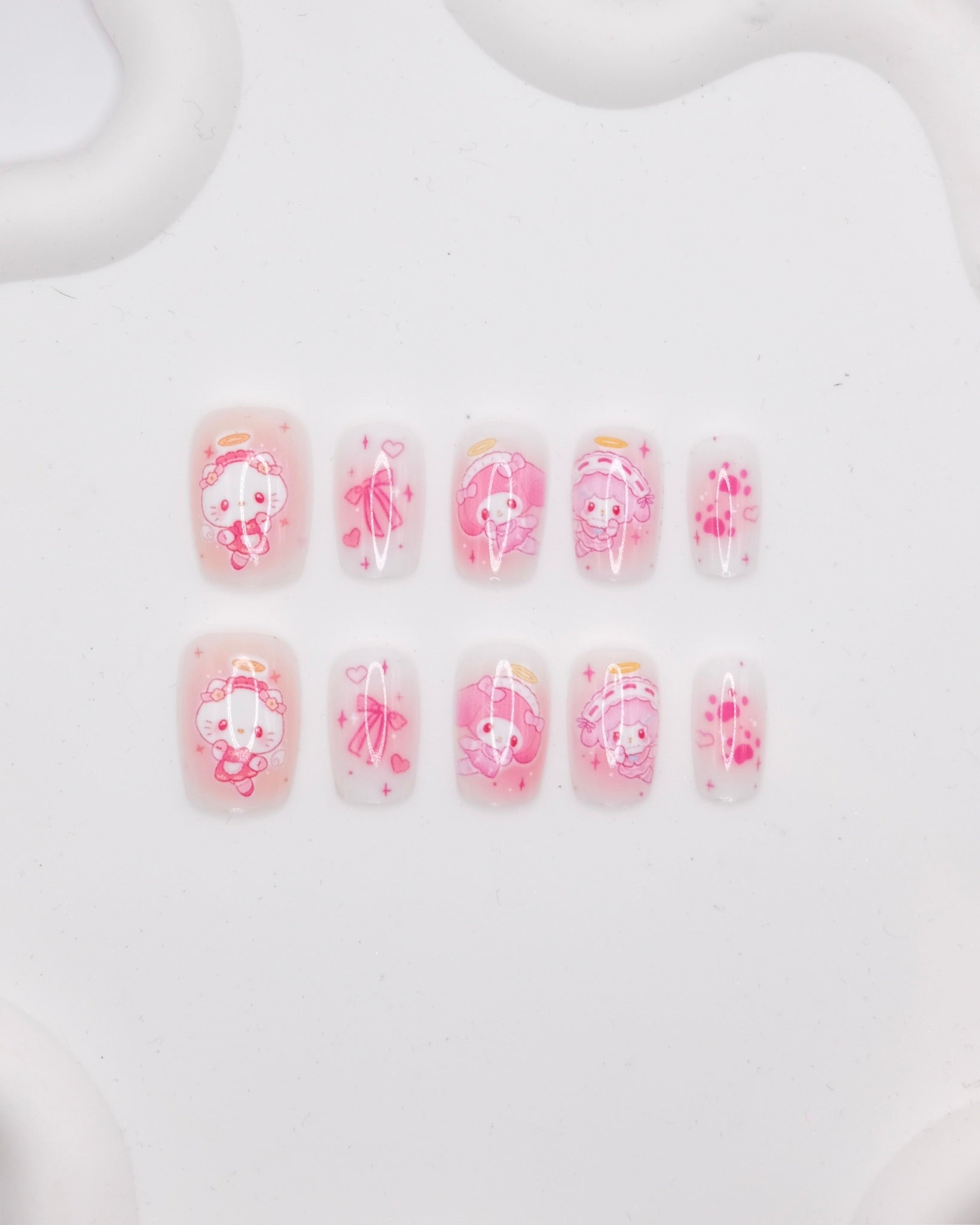Short Coffin Pink & White Anime Hello Kitty Press On Nails