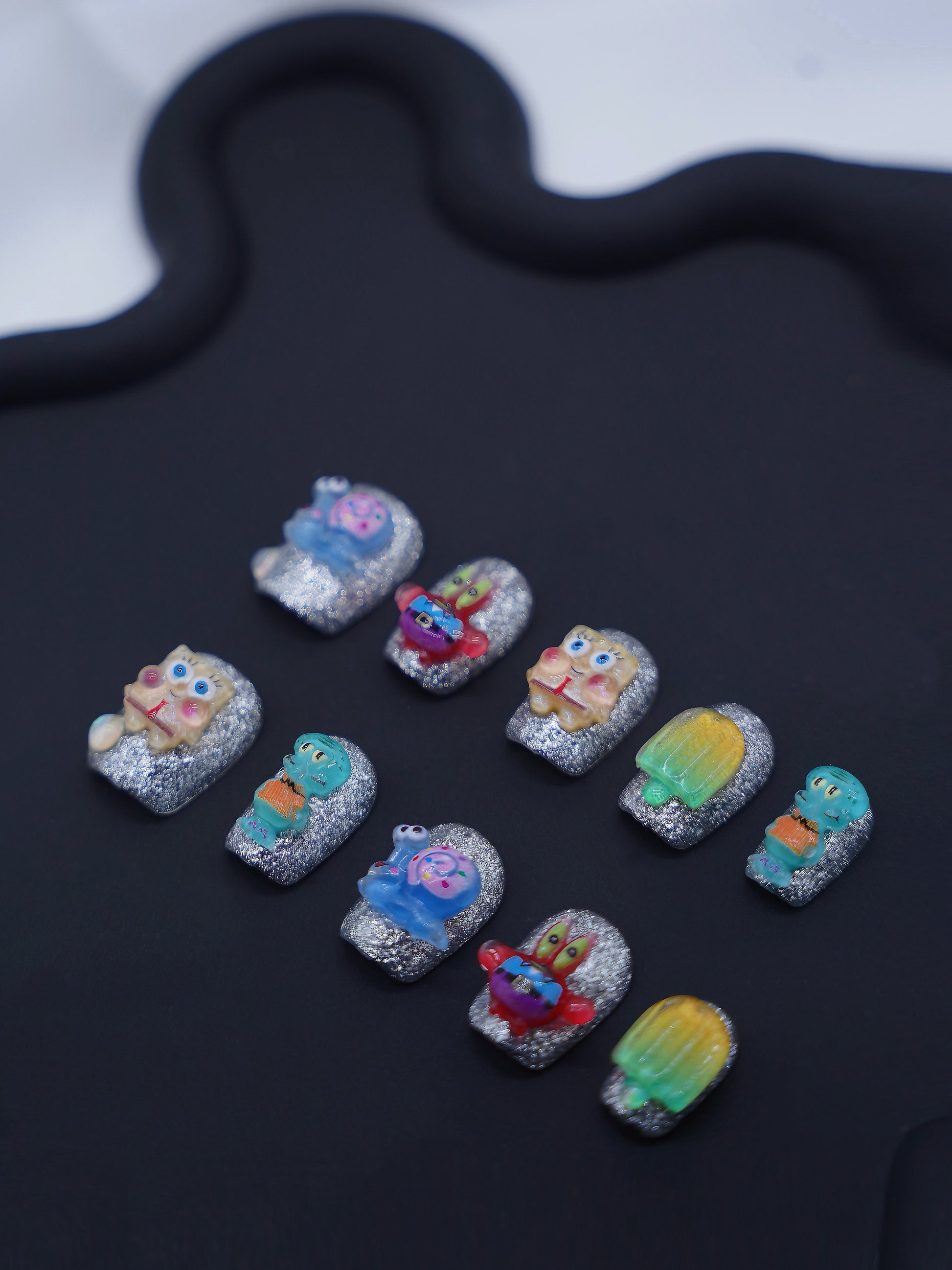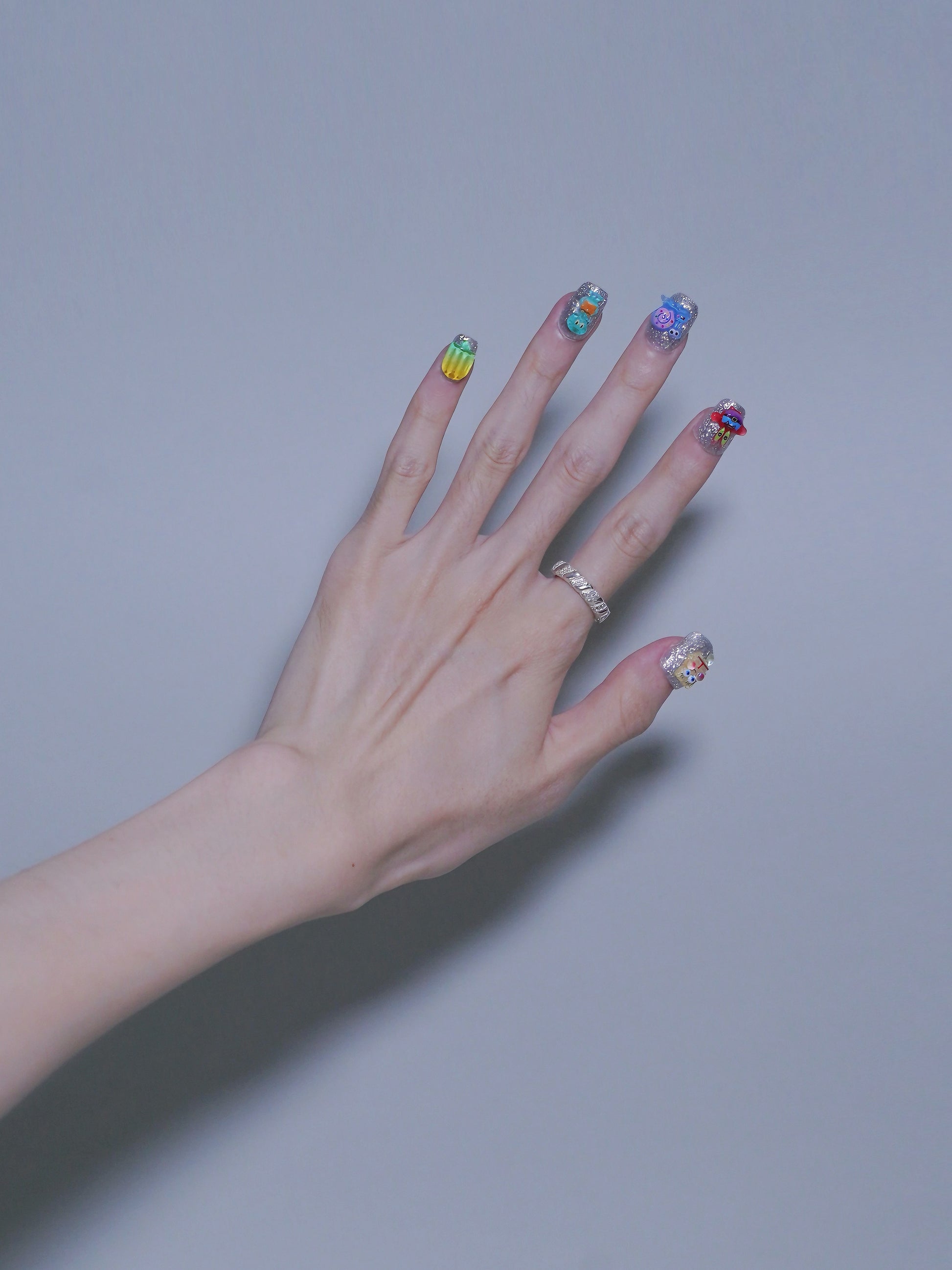 Short Rounded Shiny Silver 3D Cute Spongebob Press On Nails