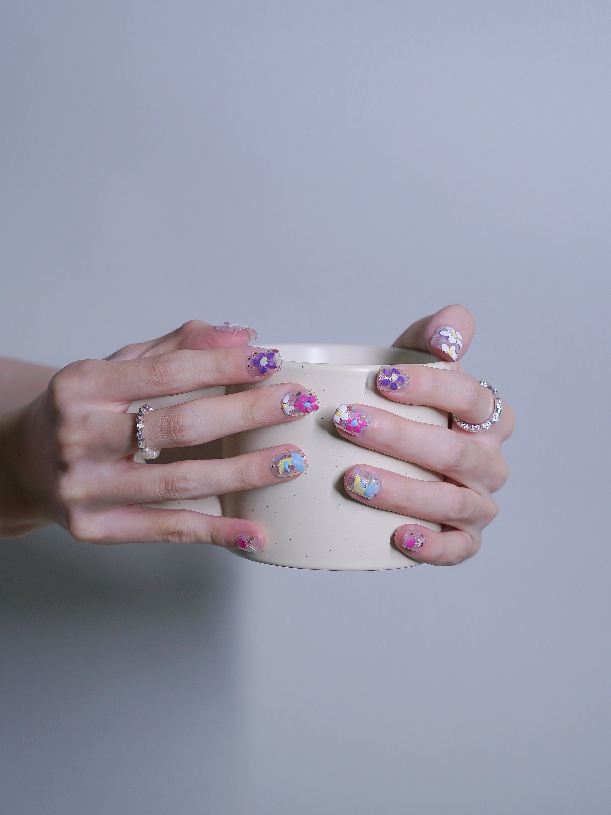 Short Rounded Transparent Embossed Painting Flower Press On Nails